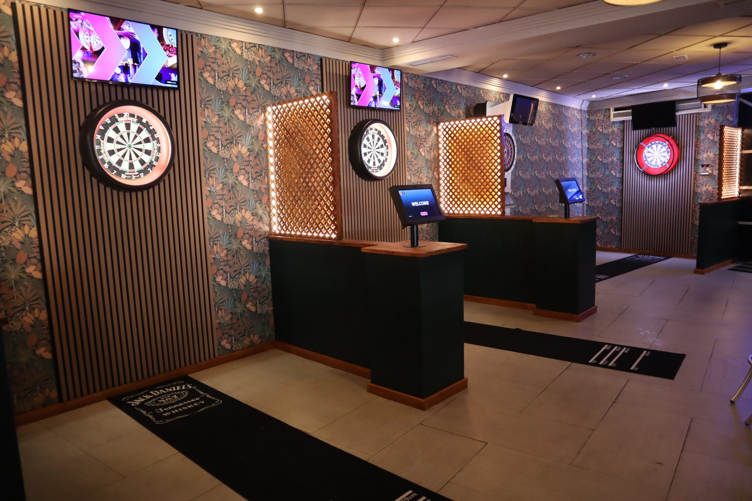 Similar to bowling lanes, players input their names and photos into our interactive computer next to their darts board.